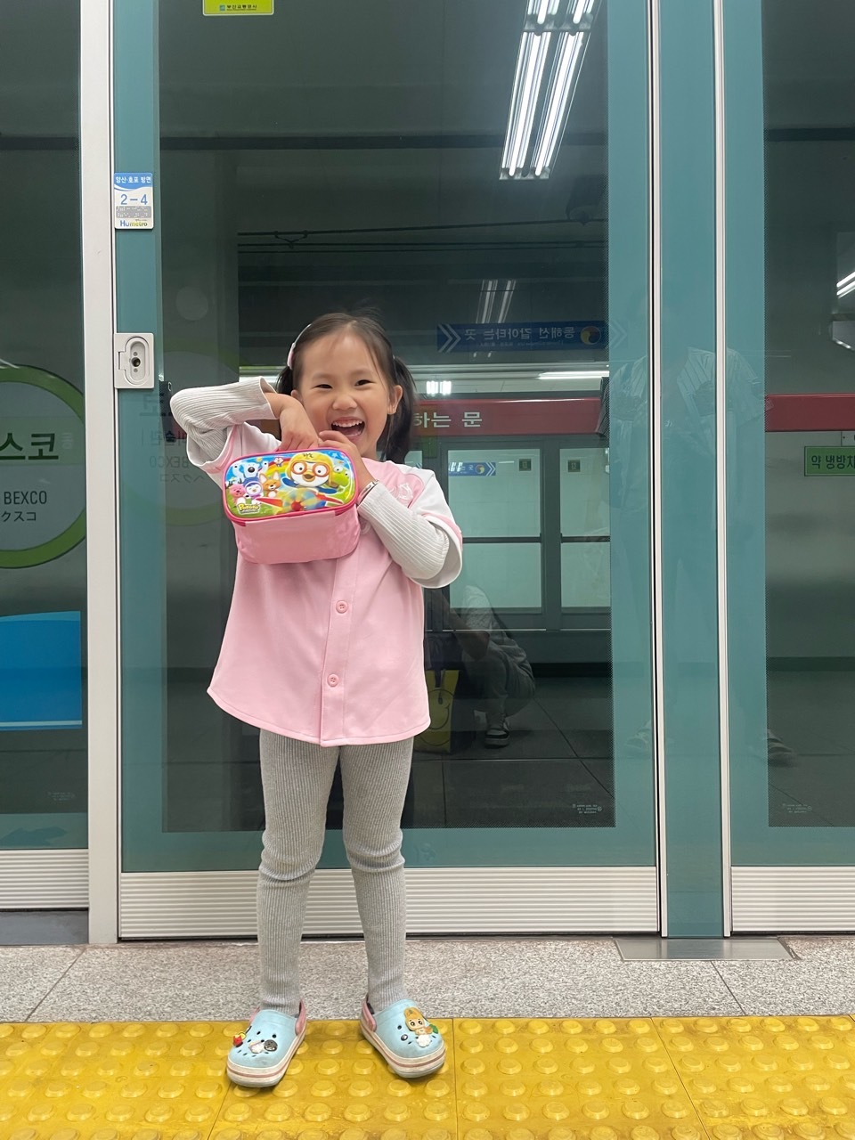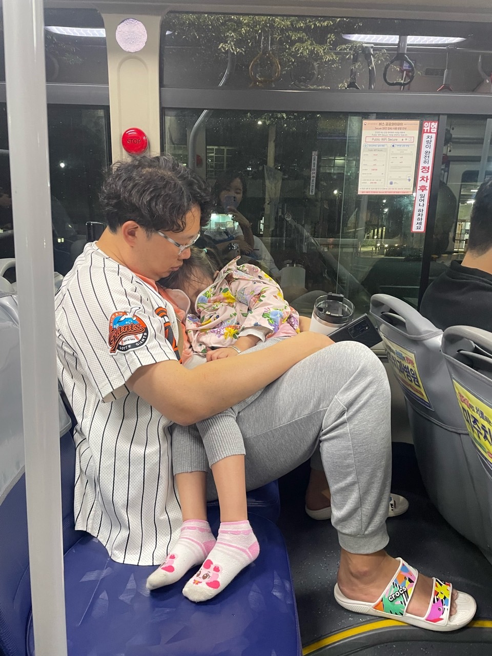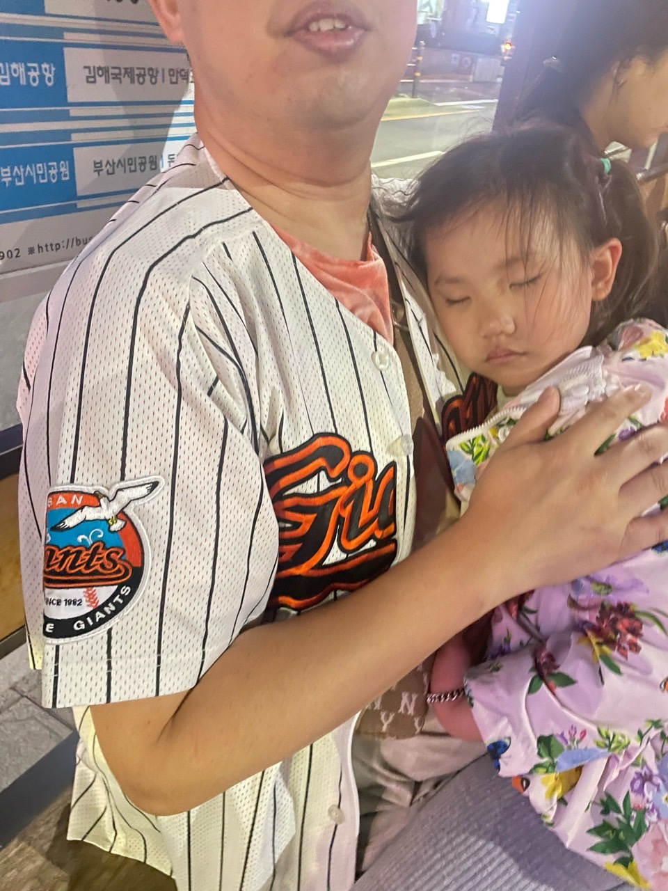 버스 타고 환승하고 다시 버스 타고 하율인 사직 구장 나오고 조금 걸으니 바로 곯아떨어졌어요. 이 조그마한 몸으로 많이 움직였어요. 아침부터 유치원 가고 학원 가고 야구장 가서 실컷 춤추고 놀고 얼마나 피곤하겠어요.