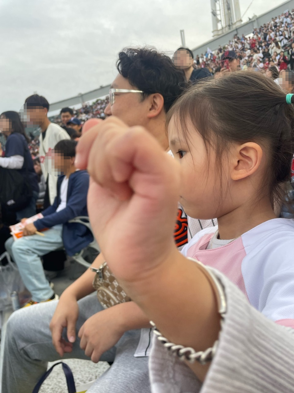 이 이후로 더 먹을 시간이 없었어요. 3회 때 5점을 냈거든요. 우리 아이 완전 신났어요. 이미 노래는 다 꾀고 있었고 이렇게 사람이 많이 모여있는 곳은 처음 데려왔어요. 그런데 이 많은 사람들이 한목소리를 내며 응원하며 즐기는 모습에 아주 신이 났나 봅니다. 너무 재미있대요. "엄마. 야구장이 너무 재밌어. 또 오자." 많이 움직이고 목소리 크게 내더니 배고픈가 봐요. 도시락도 깨끗이 다 먹었어요.