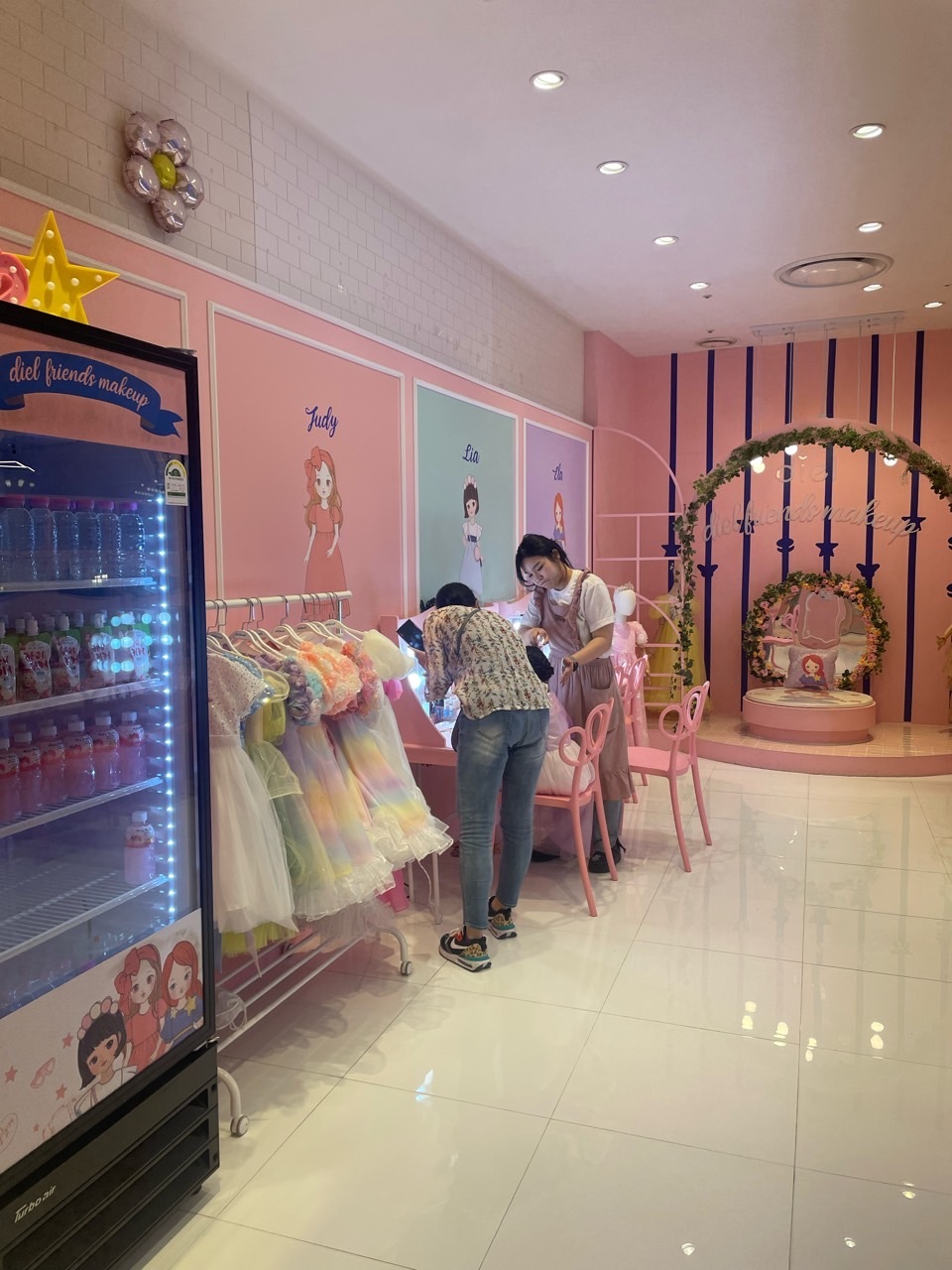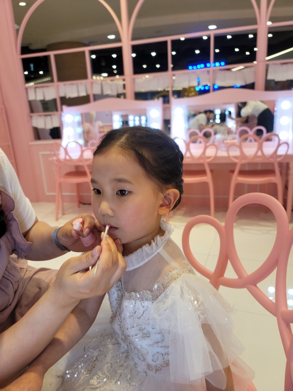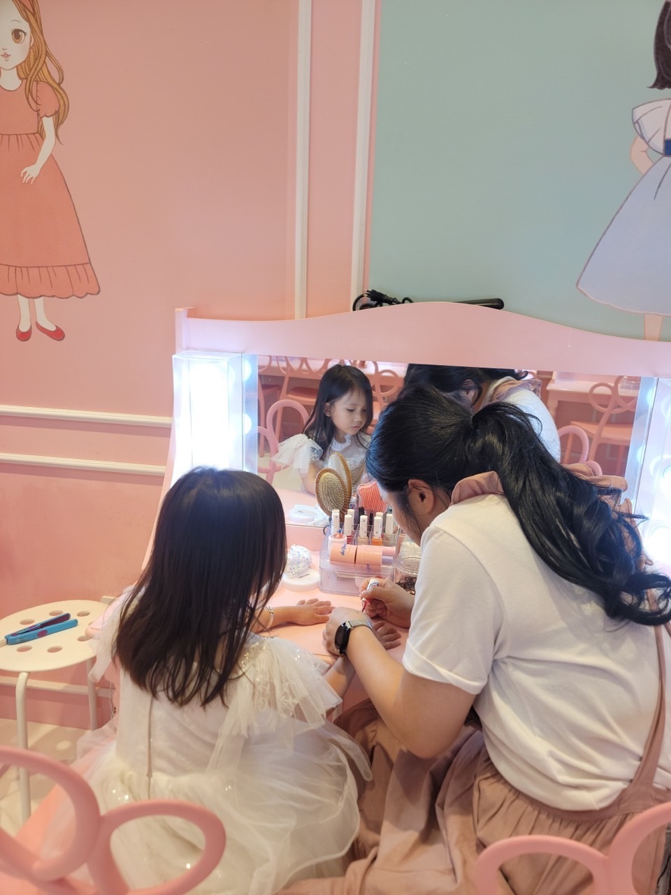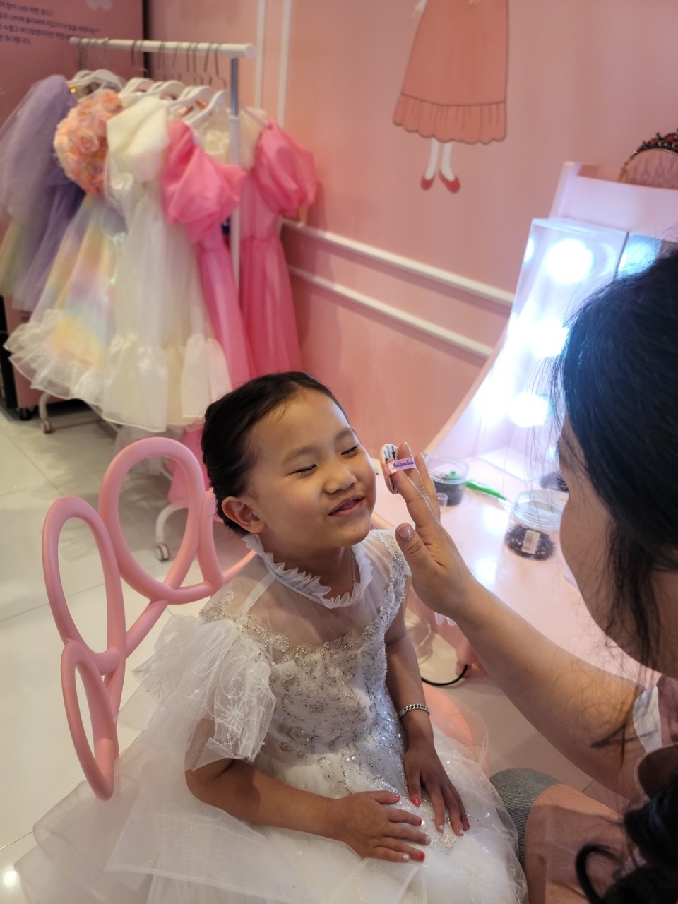 다행히 길이 막히지 않아 30분 만에 광복점에 도착할 수 있었어요. 매장에 오니 정말 아이들이 좋아할 만하겠더라고요. 입구에서부터 핑크 핑크 한 게 정말 화려해 보입니다. 드레스도 너무 이쁘네요. 이곳에선 아이들의 메이크업 체험과 함께 드레스를 입고 사진을 찍을 수 있어요. 그리고 메이크업 제품과 옷을 구매할 수도 있고 옆에선 슬라임 체험과 함께 만들기 체험도 가능합니다. 보통 메이크업 체험과 만들기 체험을 함께 많이 하셨어요. 저희는 오늘 공주놀이에 올인하였답니다. 저희가 도착했을 땐 앞 타임 아이 한 명이 메이크업 마무리를 하고 있었어요. 매장에 사람이 많이 없어 물어보니 오늘은 그래도 사람이 적은 편이라 합니다. 날씨가 안 좋을 때는 발 디딤 틈 없다고 하시네요. 아무래도 오늘 날씨가 너무 화창하여 적다고 합니다. 전 눈치싸움 성공이네요!