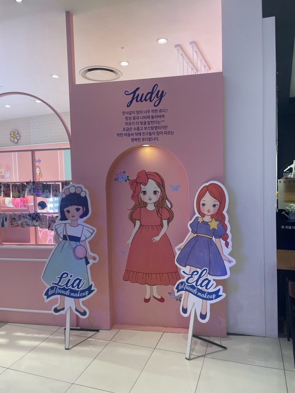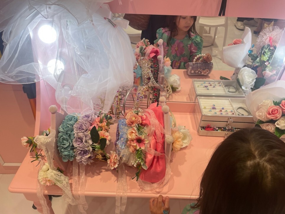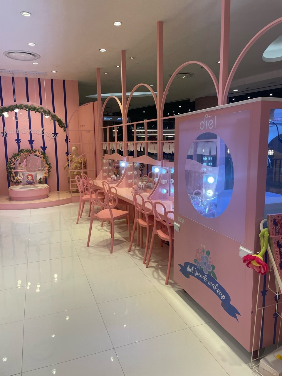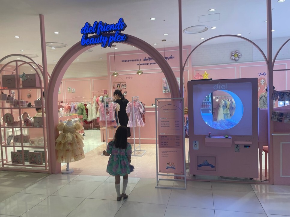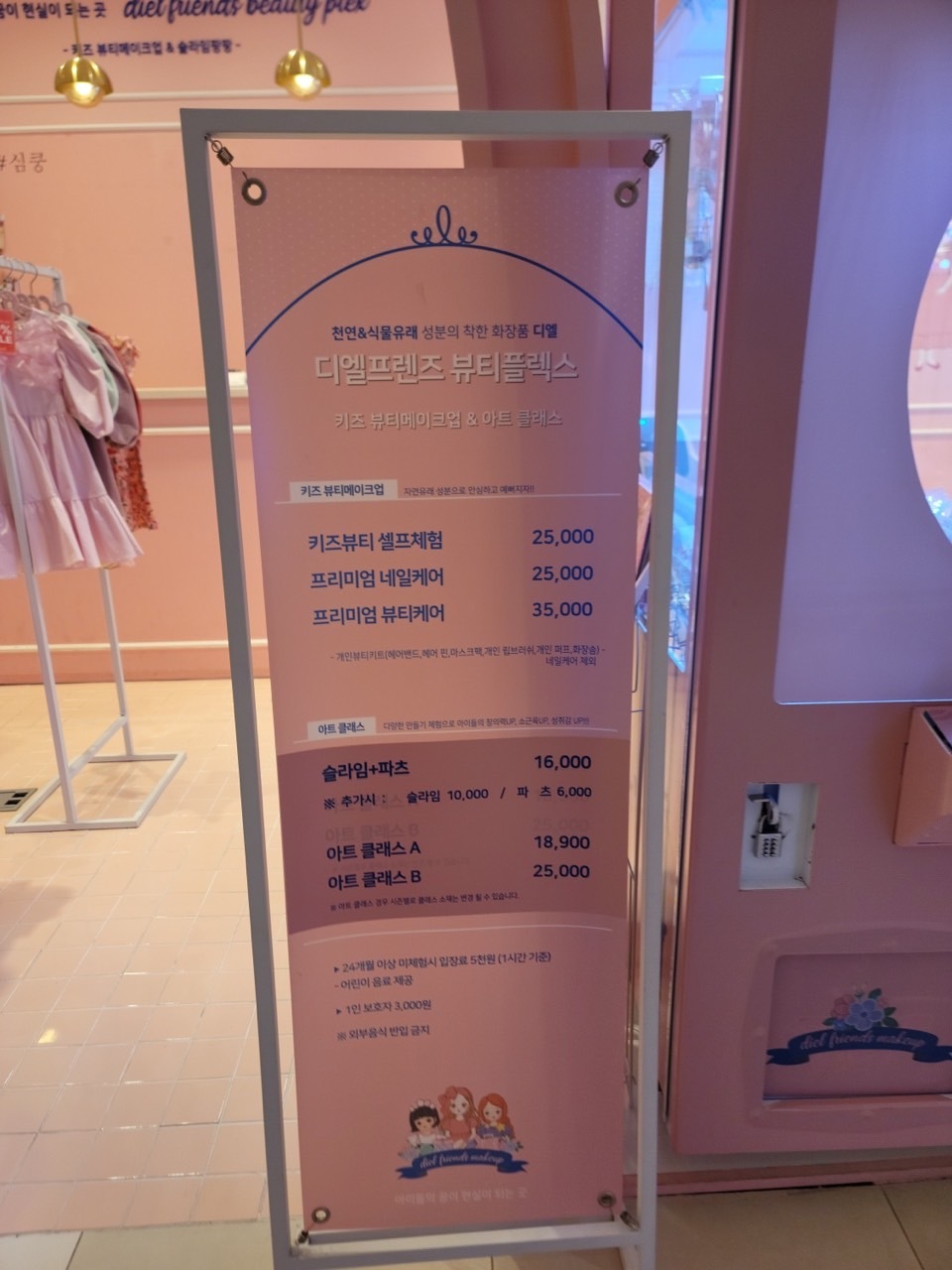 다행히 길이 막히지 않아 30분 만에 광복점에 도착할 수 있었어요. 매장에 오니 정말 아이들이 좋아할 만하겠더라고요. 입구에서부터 핑크 핑크 한 게 정말 화려해 보입니다. 드레스도 너무 이쁘네요. 이곳에선 아이들의 메이크업 체험과 함께 드레스를 입고 사진을 찍을 수 있어요. 그리고 메이크업 제품과 옷을 구매할 수도 있고 옆에선 슬라임 체험과 함께 만들기 체험도 가능합니다. 보통 메이크업 체험과 만들기 체험을 함께 많이 하셨어요. 저희는 오늘 공주놀이에 올인하였답니다. 저희가 도착했을 땐 앞 타임 아이 한 명이 메이크업 마무리를 하고 있었어요. 매장에 사람이 많이 없어 물어보니 오늘은 그래도 사람이 적은 편이라 합니다. 날씨가 안 좋을 때는 발 디딤 틈 없다고 하시네요. 아무래도 오늘 날씨가 너무 화창하여 적다고 합니다. 전 눈치싸움 성공이네요!