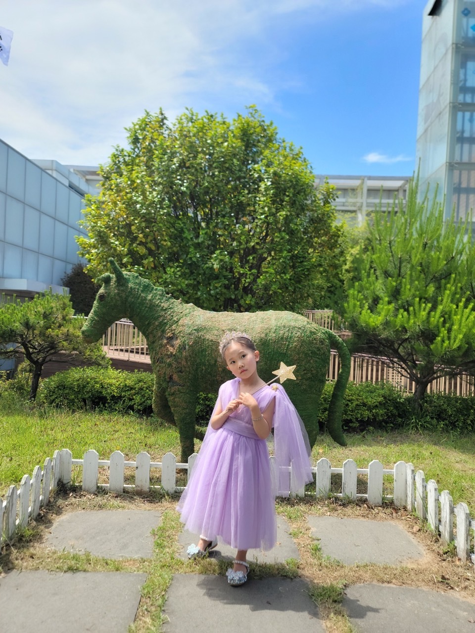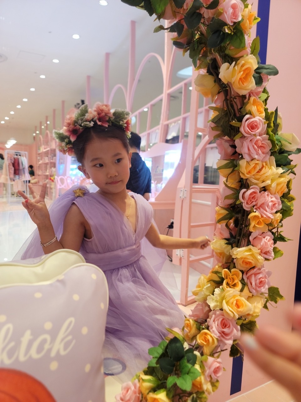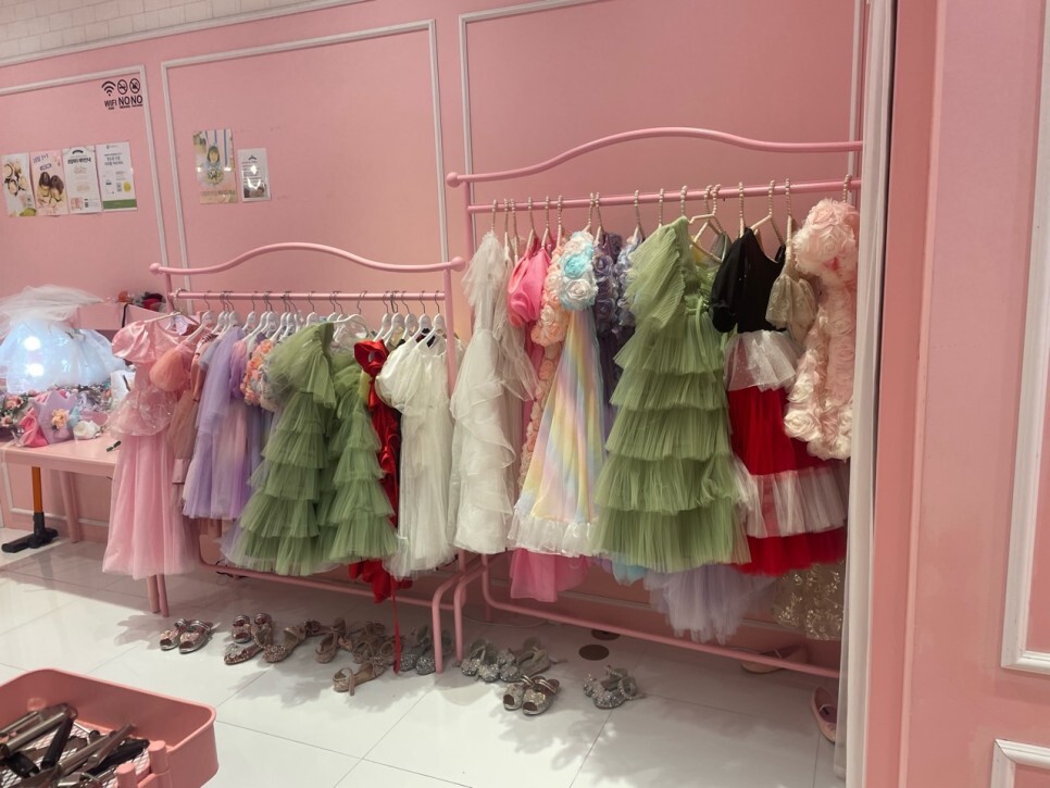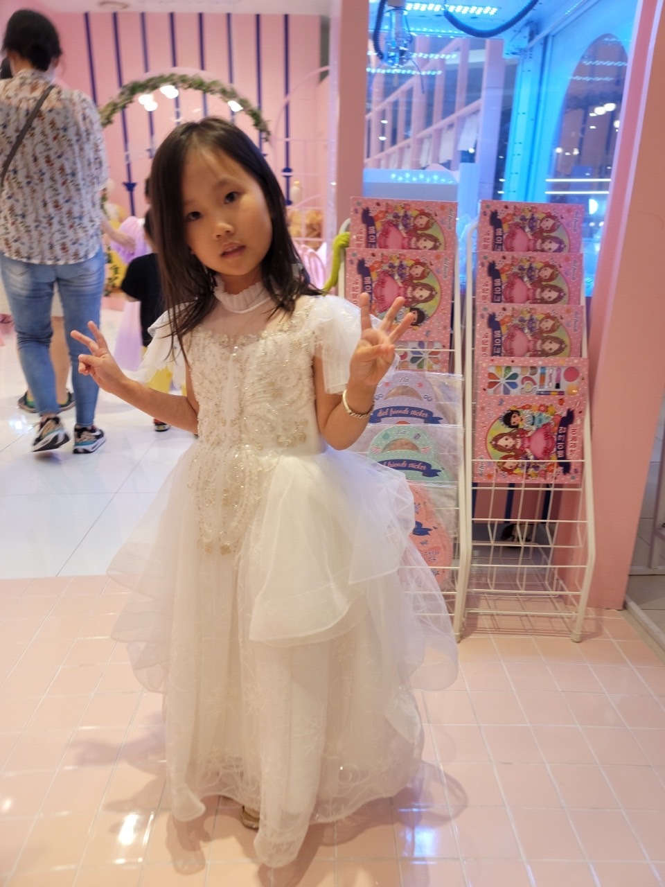 시간은 딱히 정해주지 않았어요. 드레스 한 벌당 최대한 사진 찍으려고 해도 나름 한계가 있더라고요. 그래서 얼른 두 번째 드레스도 갈아입었어요. 직원분들이 드레스 입고 백화점 옥상의 정원에서 사진 찍어도 된다고 하여 두 번째 드레스를 입고 밖에 나가보려 합니다. 오늘은 그래도 예약이 적은 편이라 원하는 만큼 찍고 오시라 했어요. 백화점 내에만 있으면 된다 하시네요. 바쁜 주말엔 아예 엄두가 안 나 보입니다. 그리고 드레스 경쟁도 치열할 것 같네요. 저흰 저희 앞 타임 아이 한 명뿐이라 아이 둘의 취향이 달라 다행히 원하는 이쁜 드레스를 입고 다녔어요.