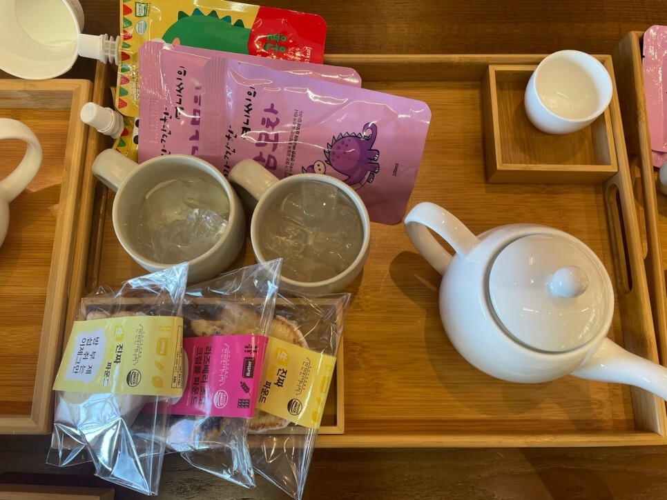 카운터에서 인원수 만큼 입장료를 지불해요. 저흰 이미 오후에 들어가 아주 사람이 많아 자리 구하기가 힘들었어요. 워낙 아이들 놀기 잘해놔서 엄마들이 집에 가질 않았답니다. 테이블은 안과 밖 두 군데 있고 안과 밖 동시에 자리선점은 되지 않아요. 그런데 다들 놀러 가 있어서 그런지 짐만 덩그러니 있는 테이블이 아주 많았답니다. 입장료를 지불하면 한상 다과상이 같이 나옵니다.
