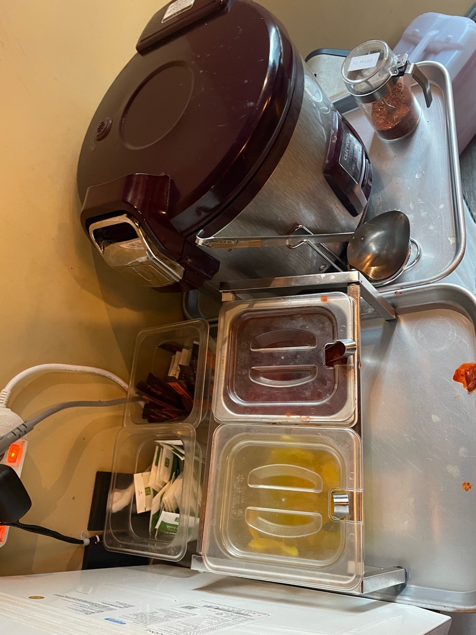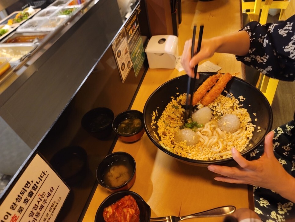 직원분은 4분이 있었는데 3분이 조리를 하고 한분은 뒷정리를 하셨어요. 주문은 키오스크로 받고 반찬이나 장국은 셀프로 먹을 수 있게 준비되어 있어 인건비 절감도 되는 것 같아요. 그래서 더 가격이 착하고 가성비가 좋나 봅니다. 주문하고 10분 정도 지나 바로 붓카케 먼저 먹을 수 있었어요. 그릇 크기도 어마어마한데 엄청 푸짐하게 양도 많도 보이네요.