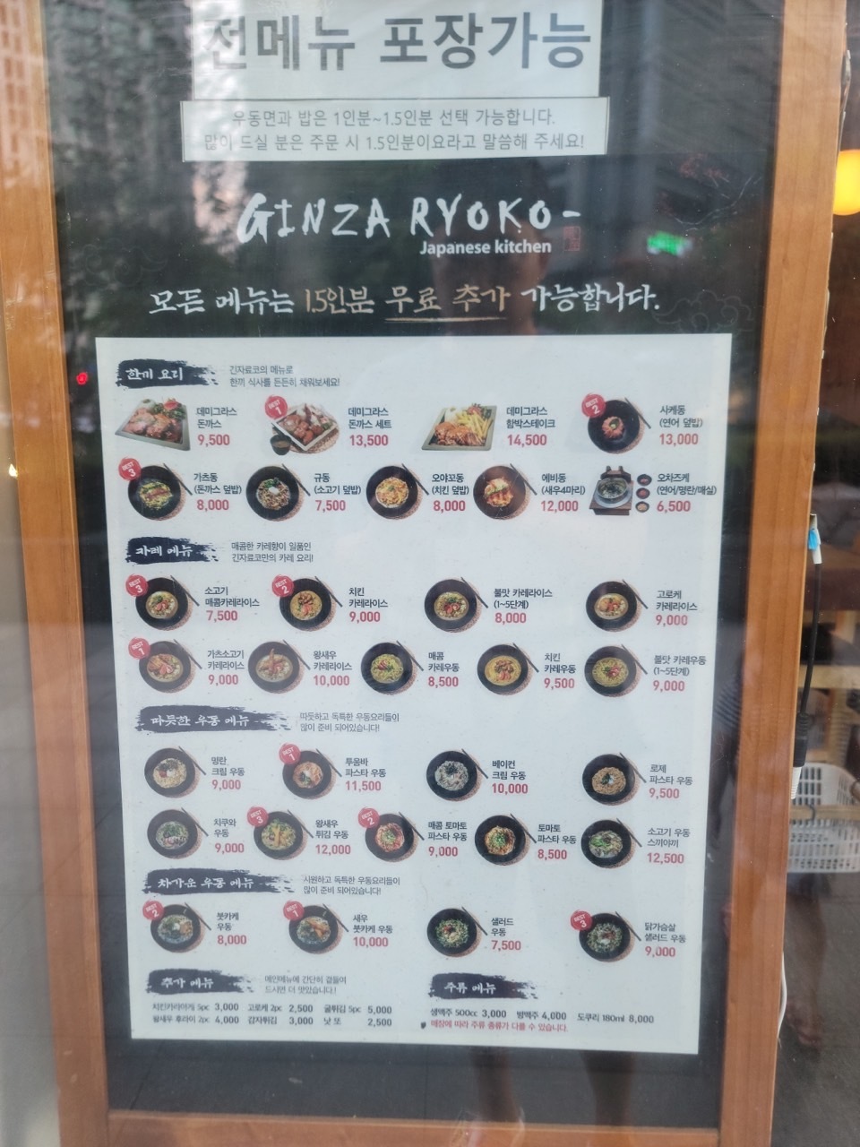 저희가 5시 조금 넘어갔을 때도 테이블이 거의 차 있었어요. 3명 자리가 부족해 웨이팅을 할 수밖에 없는 상황이었습니다. 그래서 메뉴를 살펴보며 웨이팅 했어요. 여긴 기본 양도 꽤 되는 데 우동, 밥류는 1.5인분 무료로 추가 가능합니다. 그래서 키오스크에 선택 시 1인분, 1.5인분 선택하면 돼요. 저희는 제가 워낙 붓 카키를 좋아해서 새우 붓카케 우동과 데미그라스 돈까스 세트를 먹어보기로 했어요. 각각 1.5인분으로 추가하였답니다.