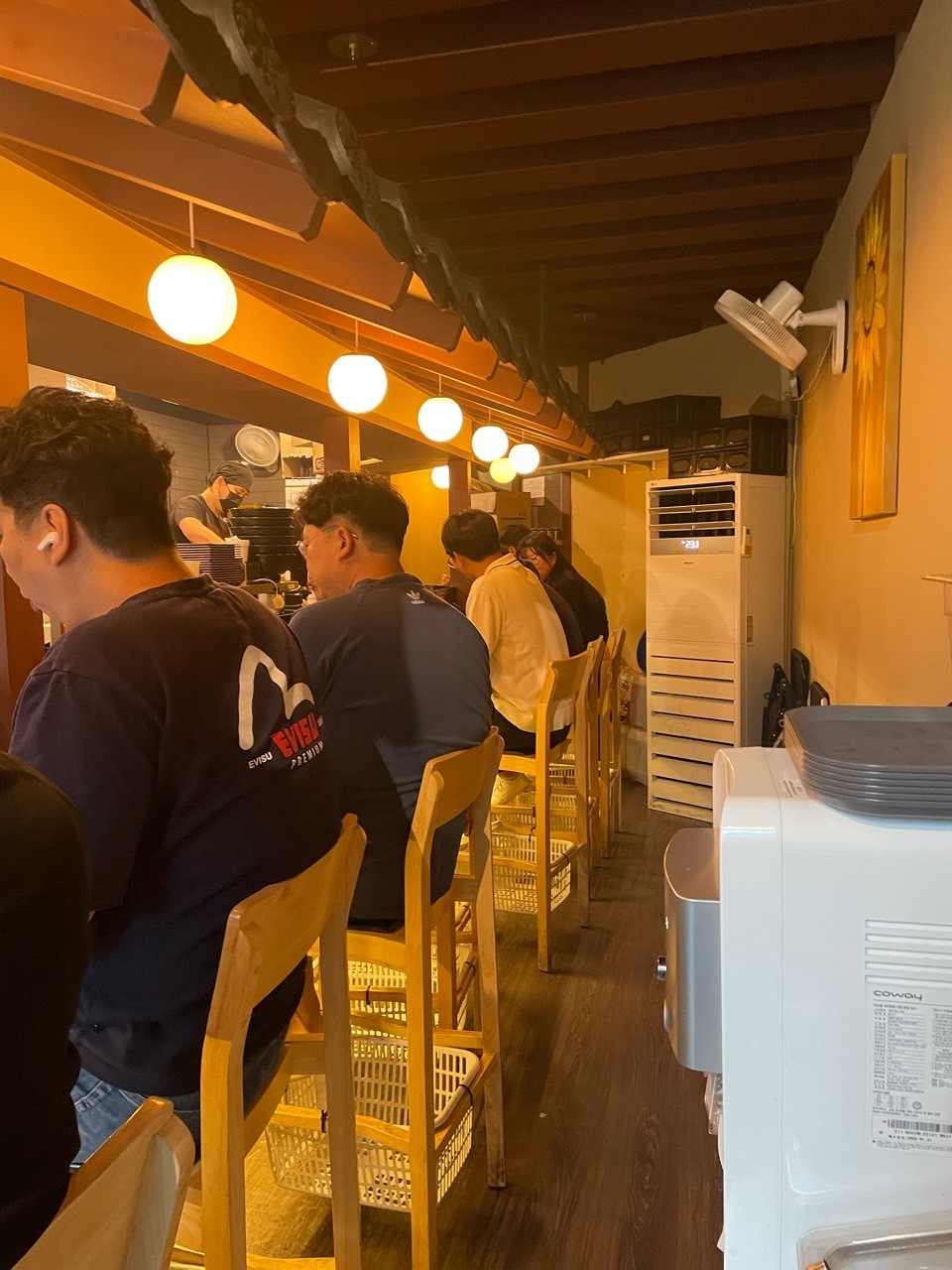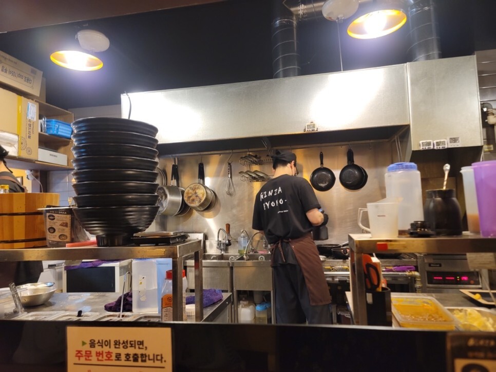 이렇게 일본식 선술집 처럼 대면형 주방으로 길게 테이블이 뻗어 있어 손님을 많이 받을 수는 없습니다. 그래서 웨이팅이 꼭 필요한 것 같아요. 그리고 너무 오픈형 주방이어서 위생, 조리법까지 다 보이더라고요. 미리 재료를 만들어 두고 바로 데워서 내보내는 식으로 보였어요.