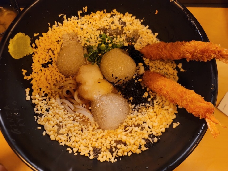 제가 알던 붓 카케와 살짝 달랐는데 이건 이거대로 맛있었어요. 그렇지만 면발은 제가 알던 곳이 더 맛있네요. 그곳이 훨씬 쫄깃쫄깃해요. 여긴 살짝 덜 익힌 느낌?이네요. 국물은 아주 시원하고 새우튀김도 아주 맛있었어요. 면발이 조금 아쉬웠지만 그래도 엄청 배불리 먹었습니다. 1.5인분 시켰는데 너무 배불러 다 먹지 못하였어요. 욕심냈네요.