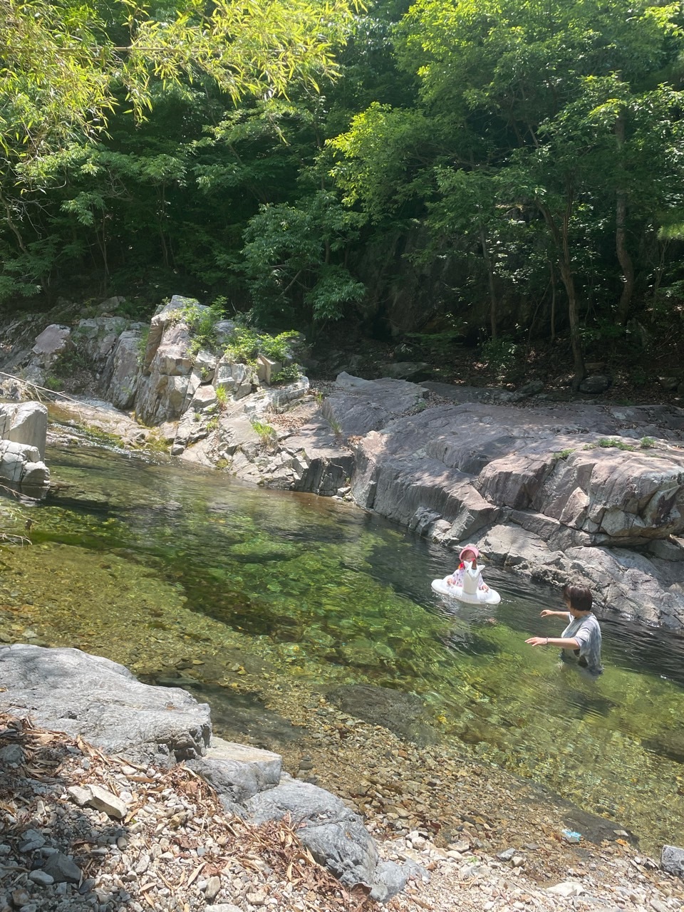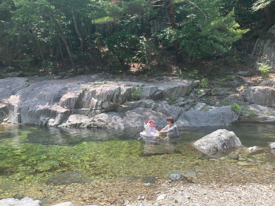저희가 놀았던 스폿은 하류 쪽이었지만 바로 옆에 화장실도 있어서 당황스러울 일 없이 즐겁게 놀다 왔답니다. 물이 너무너무 깨끗해서 사진 찍어도 다 보이네요. 깊은 쪽으로 가면 저의 가슴까지 오고 얕은 쪽으로 가면 아이들이 놀 수 있는 발목까지, 무릎까지 오는 물 높이의 스폿이 또 있답니다. 그래서 잘 놀았어요. 저는 수영하며 놀았고 하율이도 수영하고 얕은 곳 가서 또 놀고 신나게 놀았네요.