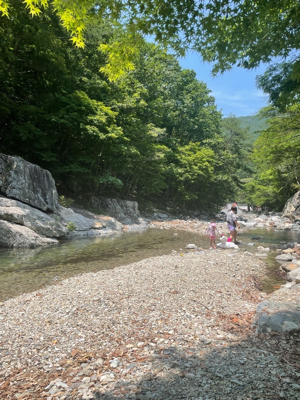자갈이 넓게 펼쳐져 있어 돗자리 깔고 놀기도 좋았어요. 계곡을 다니다 보면 간혹 쓰레기를 그냥 버리고 가시는 분들이 있던데 여러분들은 꼭 자기 쓰레기는 다 가져가시길 바라요. 계곡 중간에 쓰레기가 있으면 아주 불쾌하잖아요. 환경보호를 위해 다 같이 힘쓰자고요!