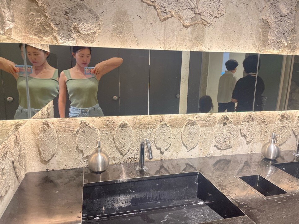 화장실 들어갔다가 깜짝 놀랐어요. 화장실도 이렇게 이쁠 일인가요? 이걸 노출 콘크리트라 할까요? 블랙 & 그레이로 아주 멋들어지게 인테리어가 되어 있어요. 거울 또한 길게 있는 것도 멋지네요.