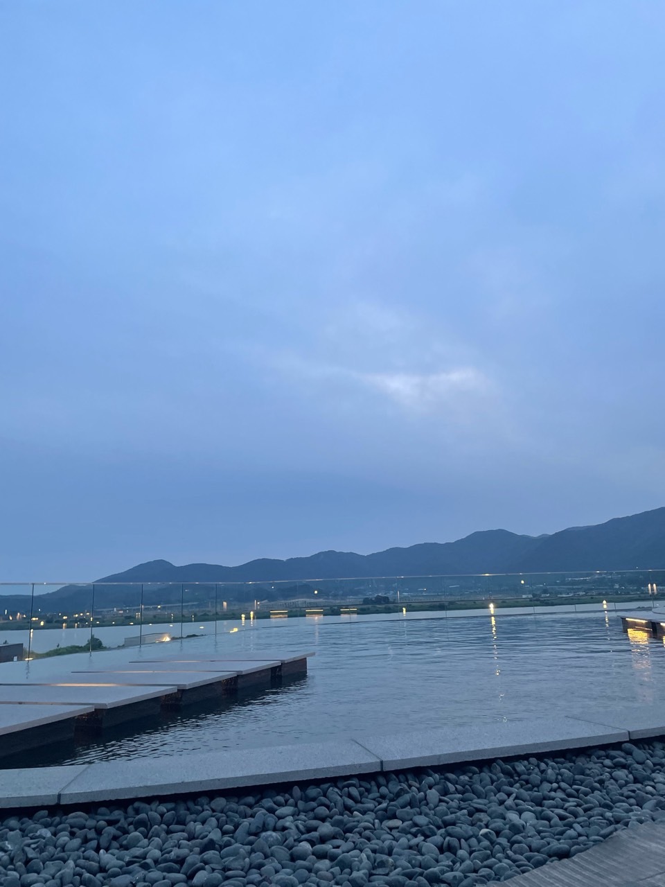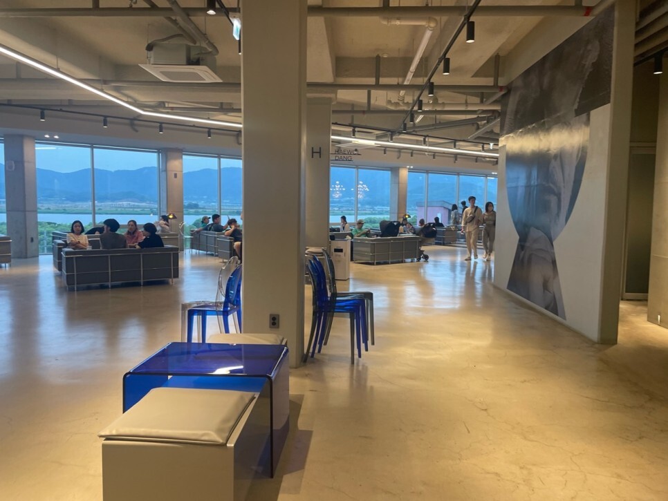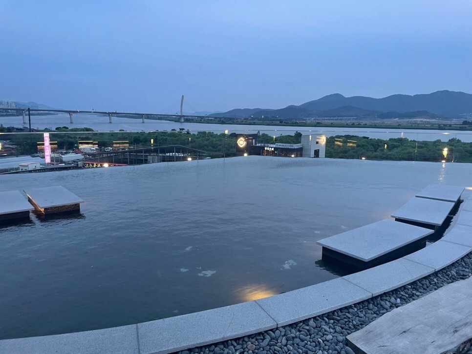 루프탑의 중간에 잔잔한 물이 흘러가요. 여기서 사진 찍으면 갬성 샷 제대로 건질 수 있을 것 같은 느낌입니다. 물 위를 둥둥 떠있는 느낌. 말 안 해도 다들 아시겠죠?(오전 물놀이의 여파로 상태가 별로라 저는 찍지 않았습니다.) 센스 있게 난간도 유리 난간으로 되어 있어 사진 속에 뷰가 더 잘 보일 것 같습니다. 낙동강 바로 인근이 아니라 잘 보일까 싶었는데 웬걸. 높으니 더 잘 보이네요. 커플이라면 꼭 루프탑 가세요. (2층은 아이들이 많아 난립니다.)
