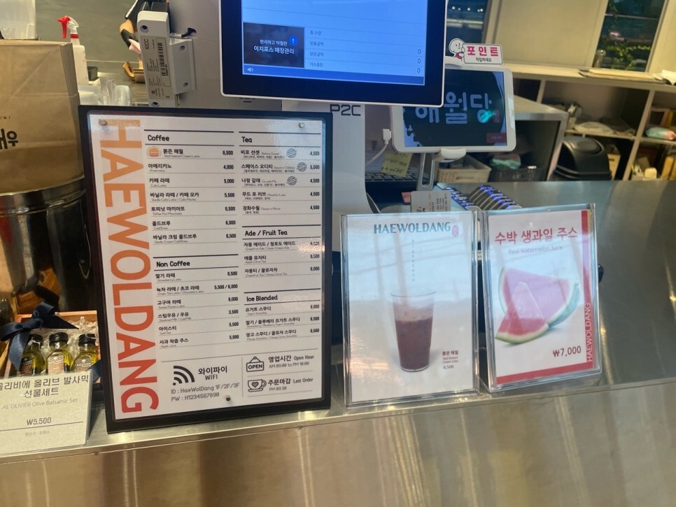 카페의 음료수는 생각보다 가격이 높지 않아요. 아메리카노 4000원 제일 비싼 수박주스가 7000원이네요. 요즘 기장의 오션뷰 대형카페를 가면 아메리카노가 기본 6000원 정도 해서 높은 물가를 실감하고 있답니다.