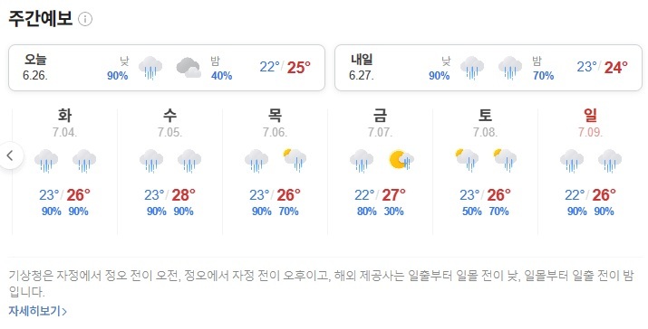 역시 종일 비가 옵니다. 대부분 90% 이상의 비가 온다 하니 다음 주 역시 놀기엔 힘들 것 같아요. 물놀이 대신 실내 위주로 알아봐야 할까요? 비 오면 대부분 실내로 몰려서 역시나 사람 많을 것으로 예상됩니다. 일단 적어도 이번 주 비 오고, 다음 주도 내내 비가 오네요. 이러다가 정말로 7월의 3일을 제외하고는 다 비가 오는 건 아닌가 모르겠어요. 저지대 사시는 분들은 침수피해가 일어나지 않도록 잘 대비해 주시고 농사짓는 분들은 아무쪼록 농산물에 피해가 많이 없었으면 좋겠습니다. 정말 7월 내내 비가 온다면 어떡하면 슬기롭게 여름을 보낼 수 있을지 저도 고민해 봐야겠어요.