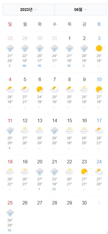 6월 한 달 날씨입니다. 비가 제법 많이 왔죠? 비가 안 온 날에는 구름이 많이 껴 있는 등 화창한 날씨는 아니었어요. 특히나 5월 말 - 6월 초는 내내 비만 왔네요. 6월의 날씨도 이랬는데 26일부터 장마 시작이라 많은 비가 내리고 있고 또 앞으로도 많은 비가 내릴 거고요.
