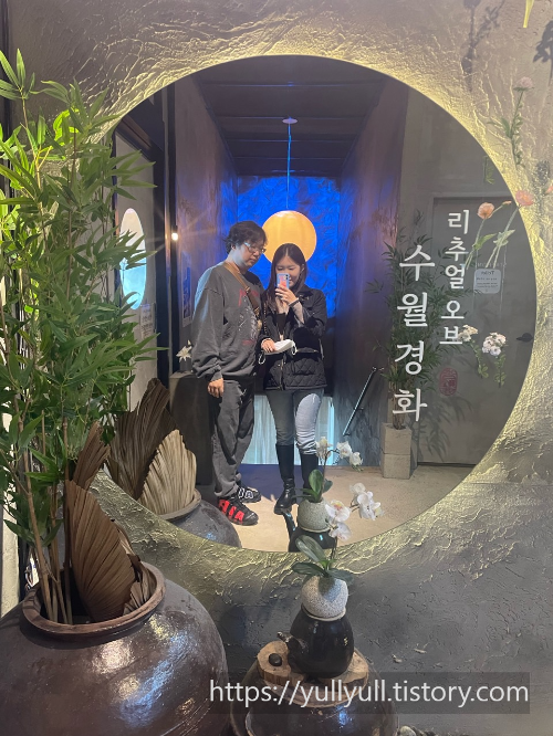 마지막으로 내려가는 길에 또 다른 포토존이 있어요. 수월경화는 4층에 있답니다. 3층은 리추얼 오브 수월경화라고 해서 예약제로 에프터눈티를 판매하는 곳이에요. 그 입구에서 찍은 포토존입니다. 리추얼 오브 수월경화는 인터넷으로 미리 예매하고 가시면 된답니다. 다음에 친구들과 가보려고 해요. 당일 예약은 안 되는 걸로 아는 데 혹시 모르니 미리 전화해 보고 가세요.