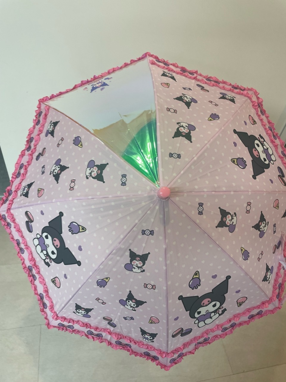 중간에 투명 홀로그램이 있어 아이들의 시야에 방해가 되지 않게 했어요. 덕분에 비가 와 우산을 푹 쓰고 있어도 아이들이 앞을 잘 볼 수 있게 되어 있네요. 거기에 귀여운 쿠로미까지 쏙 있답니다.