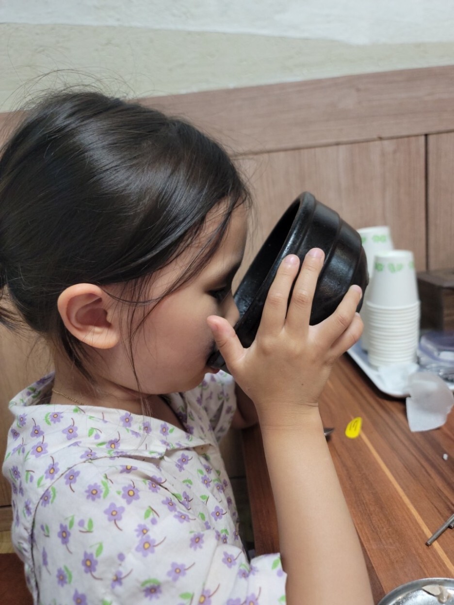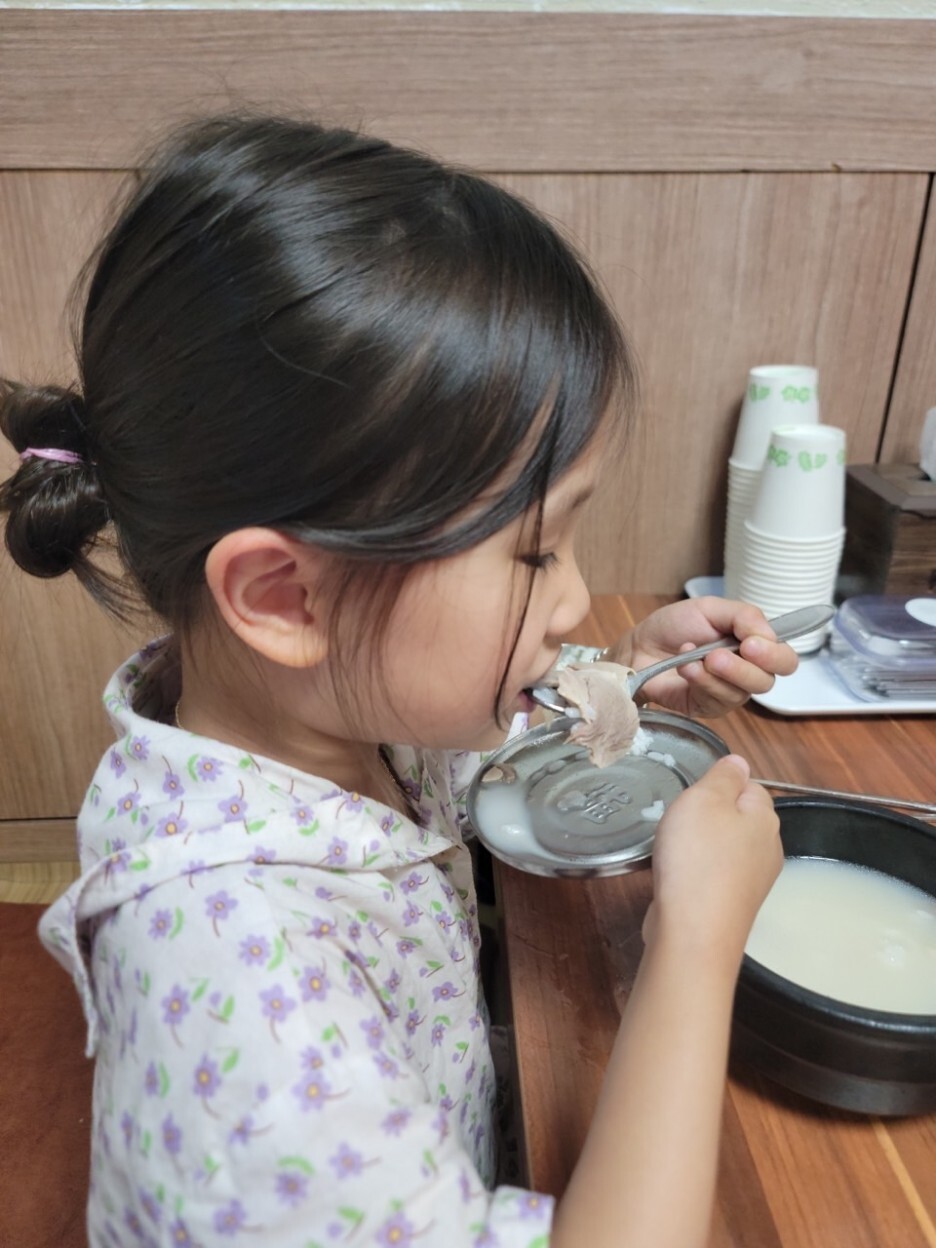 저희 딸 잘 먹는 것 봐주세요. 저희 딸이 그냥 밥은 참 안 먹는 데 여기선 먹어라 소리 안 해도 스스로 저렇게 다 먹어요. 아기 국물은 달라 하면 저렇게 큰 그릇에 국물 담아 주세요. 아기 수저와 함께 말이에요. 그래서 저희는 저희 국밥을 곱빼기 시켜서 다진 양념 섞기 전에 고기를 덜어 줘요. 그러면 공깃밥 한 공기 추가로 시키면 딱이랍니다. 그런데 먹는 걸 보아하니 조만간 한 그릇 먹을 것 같네요.