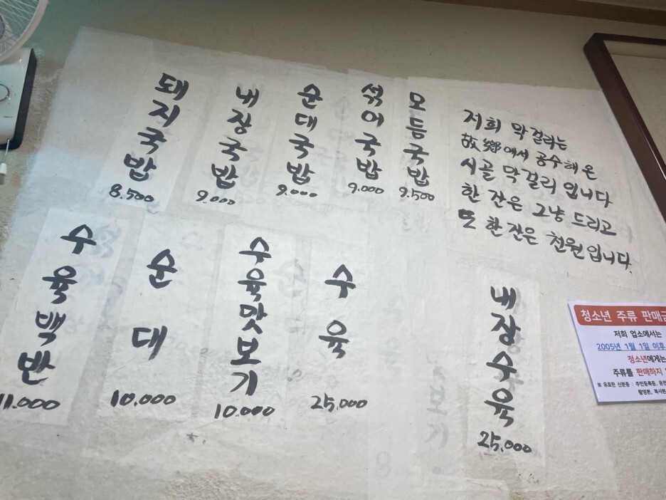 이 문구가 가게 중간에 붙어있어요. 얼마나 국물에 자부심이 있는지 알 수 있습니다. 실제로 먹어보면 누린내가 하나도 나질 않아요. 국물도 뽀얗고 국물도 진해서 먹으면 속이 편안하답니다. 저희 식구들은 항상 국물 다 마시고 와요.