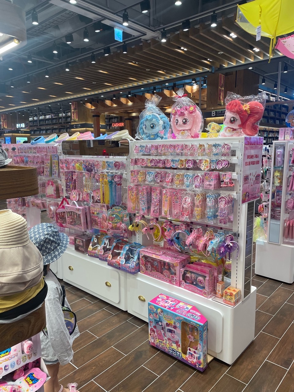신세계몰 지하 2층 제일 안쪽 자리에 서점이 커다랗게 자리 잡고 있어요. 입구부터 다양한 분야의 책들이 진열되어 있답니다. 조금만 가다 보면 이렇게 티니핑의 압박을 볼 수 있어요. 여기 여아들이 바글바글하답니다. 하율이도 여기서 눈을 못 때요. 한참을 바라보고 들어가거든요 인내심을 가지고 어느 정도 기다려 줍니다. 이렇게 하다 보면 책이랑 익숙해지고 서점 오는 것이 자연스러워지겠죠? 이제는 안 사줄걸 알기에 하율이도 한참을 구경하고 안쪽 어린이 서점 코너로 간답니다. 이렇게 가다 보면 장난감도 보이고 만화책도 보여요. 아직은 만화를 즐길 나이가 아니라 하율이의 관심을 끌진 못하네요.