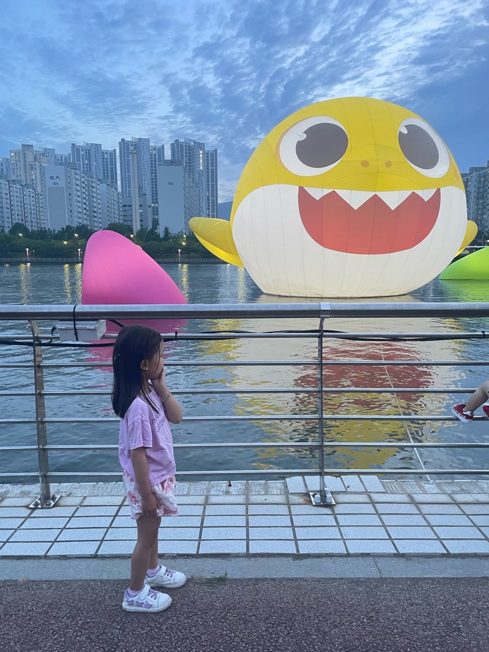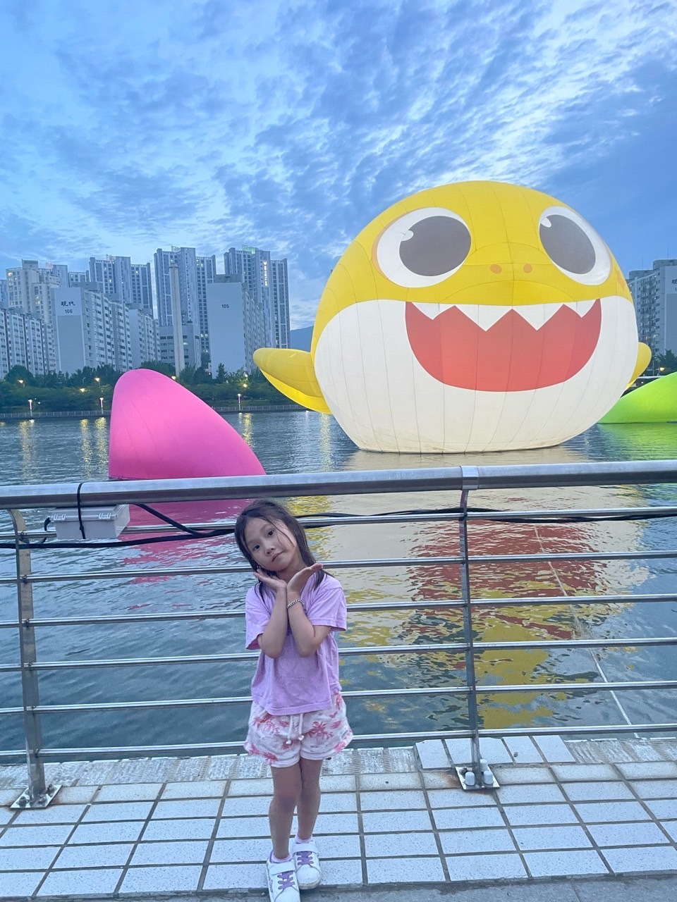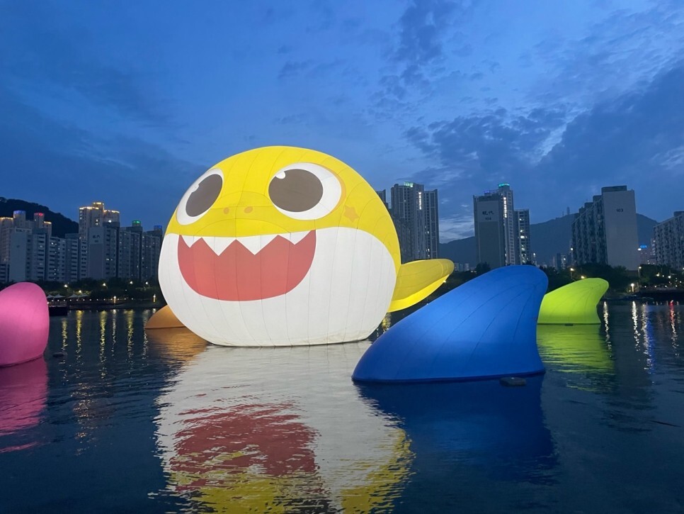 낮의 아기 상어도 이쁘지만 밤이 더 이쁜 것 같습니다. 뭔가 더 상어 같은 느낌(?)이 들어요. 그리고 뒤의 야경과 함께 너무 이쁘네요. 계속 있었으면 좋겠어요. 귀여워요. 너무