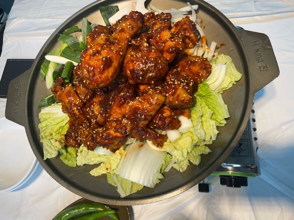 저희도 닭볶음을 시켰고 생각 보다 음식은 금방 나온답니다. 이렇게 약간 지고 바 숯불치킨처럼 닭볶음이 나오고 닭볶음은 바로 먹을 수 있고 음식이 보글보글하면 밑의 야채에서 물이 나와 나중에 볶음밥도 드실 수가 있어요. 전 여기를 좋아하는 이유가 닭볶음탕은 집에서도 얼마든지 먹을 수 있지만 여기 닭볶음은 집에서 먹을 수 없는 닭볶음이라는 것입니다. 치킨처럼 나오지만 양념은 너무 맛있어요. 따뜻하게 보글보글 드실 수 있어요. 밑반찬도 나오지만 닭볶음을 먹느라 밑반찬은 거의 안 먹었네요. 여기 음식은 모두 3인분입니다. 이 닭볶음탕이 3인분이에요. 저희는 두 명이 먹었고 볶음밥까지 다 먹었답니다. (볶음밥까지 먹으니 너무 배불렀어요.) 기본으로 떡사리 2개, 당면, 감자, 당근 조금 들어 있어요. 야채 사리, 떡사리, 당면 등은 사리 추가가 가능하답니다.