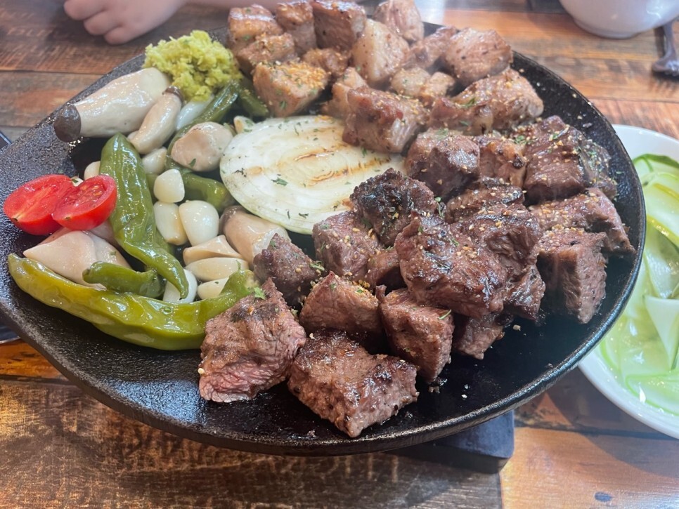 막국수 세트엔 소고기 200g과 목살 200g이 나와요. 고기세트엔 여기에 삼겹살 200g이 추가된답니다. 야채와 고기가 적당한 간과 함께 맛있게 구워 나오니 더 먹음직스러워요. 고기를 두툼하게 썰어 식감이 더 좋은 것 같습니다. 각 200g인데 생각보다 양이 많아 보이네요? 돌판이 따뜻하게 데워져 있어 식사가 끝날 때까지 따뜻하게 드실 수 있어요. 아이들이 먹기에도 적당한 온도이기 때문에 식힐 필요 없이 먹을 수 있네요. 반찬이 오이피클과 파무침, 양파절임이 나오지만 고기와 소스를 찍어 먹느라 전 별로 안 먹었네요. 굳이 반찬이 없어도 괜찮겠는 데요?
