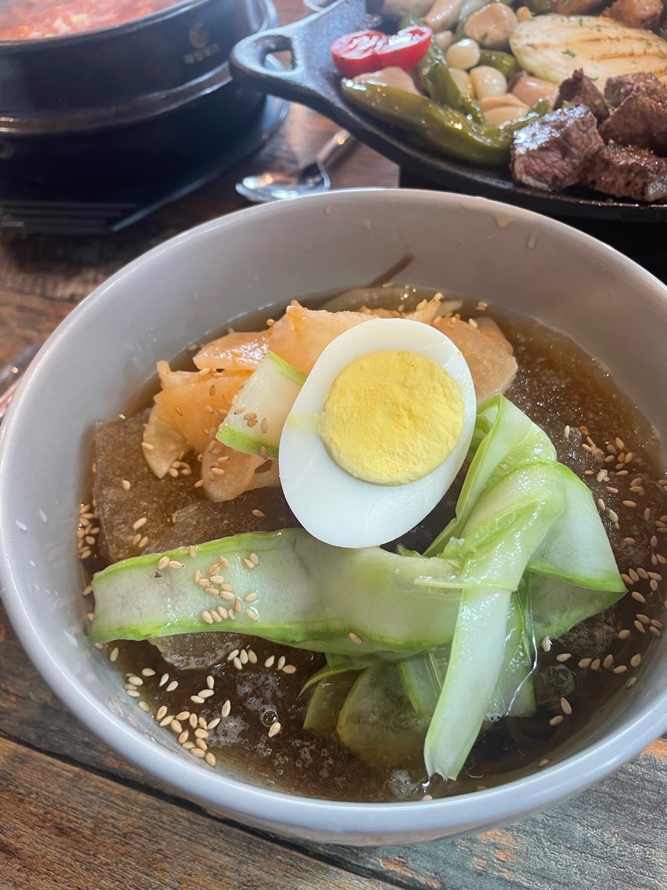 막국수는 오! 역시입니다. 진심이네요. 전 너무 새콤한 것도 싫어하는데 별로 새콤하지 않아 딱 좋았어요. 육수가 특히 맛있었어요. 같이 고명으로 나온 오이도 너무 맛있어요. 이것 역시 새콤하지 않아요. 빨간 양념이 있어 아이들이 함께 먹어보진 않았습니다만 잘 먹을 것 같네요. 다음에 방문하게 되면 비빔과 들기름을 꼭 먹어 볼 거예요.