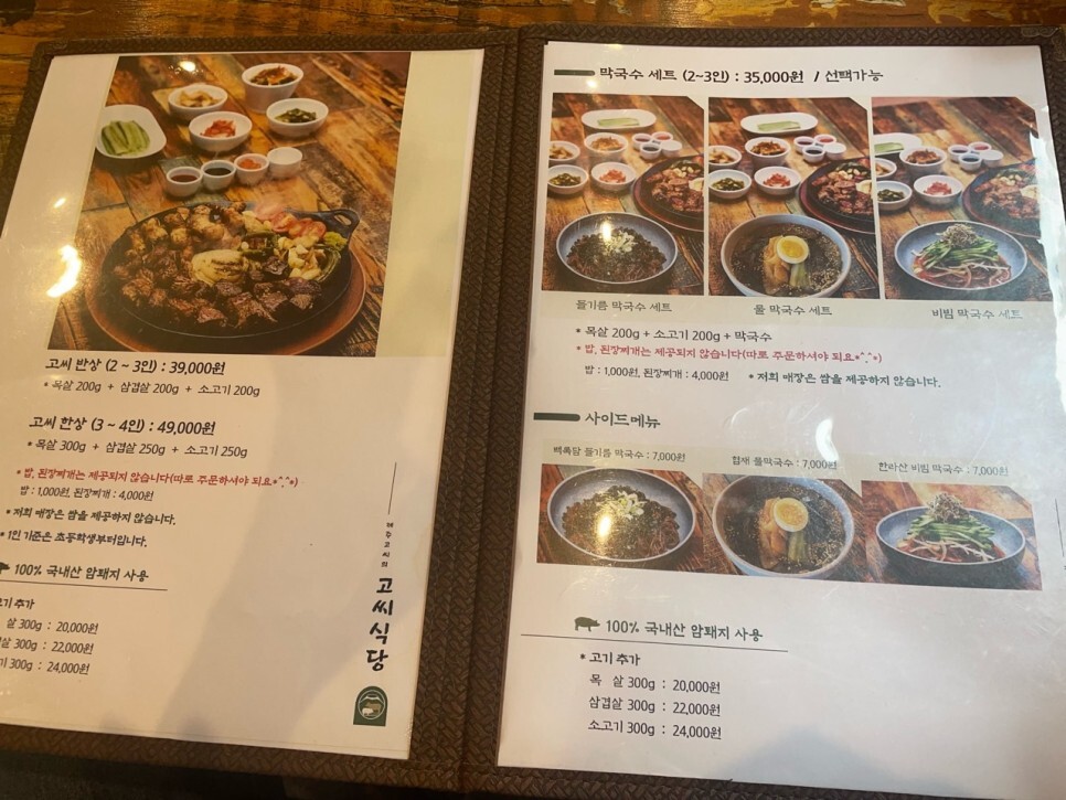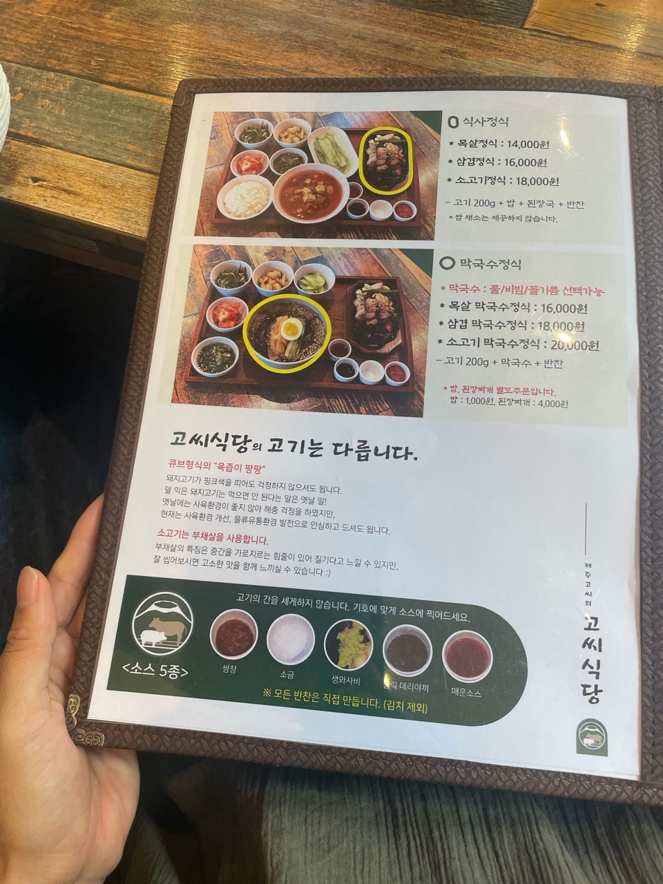 메뉴는 1인 메뉴도 있고 2~3인 메뉴도 같이 있어요. 모자라시면 고기 추가도 가능합니다. 이 세트메뉴엔 밥과 된장찌개가 포함되어 있지 않아요. 따로 시키셔야 합니다. 그리고 쌈은 따로 나오지 않아요. 대신 소스가 5종이나 나온답니다. 종류별로 취향 따라 드시면 될 것 같네요. 전 고추냉이와 매운 소스가 맛있었어요. 저희 테이블은 막국수 세트에 밥과 된장찌개를 시켜 먹었답니다. 이곳은 막국수에도 진심인 게 느껴지는 게 종류별로 막국수가 있네요. 막국수와 고기를 함께 먹으면 너무 맛있을 것 같네요. 저의 취향은 들기름이나 비빔막국수이지만 아이가 있어서 물 막국수 세트를 주문하였어요.