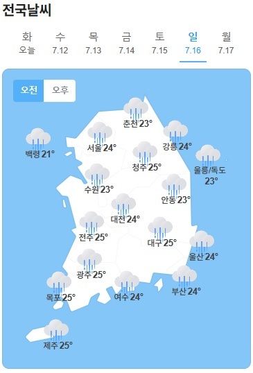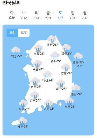 7월 12일 날씨입니다. 몇몇 지역은 오전에 강한 비가 내리고 오후에도 흐리거나 비가 내린다 되어 있어요. 특히 내일까지 강한 비가 내린다 하니 그에 따른 대비가 필요해 보여요. 비가 많이 와 온도도 다들 낮네요.