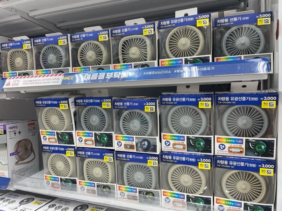 그리고 진열대 한편을 가득 차지하고 있는 선풍기들이 보입니다. 예전엔 선풍기 하나도 비싸게 주고 샀는데 이제는 5000원에 살 수 있네요. 집게형 선풍기, 스탠드 선풍기 등 종류별로 가득합니다. 예전에 하율이가 어렸을 때 집게형 선풍기 사서 유모차에 달아 잘 쓰고 다녔답니다. (전 비싸게 줬네요. 휴 ) 집게형 선풍기는 제 눈에 보이는 것만 3종류나 되네요. 그 외에 차량용 선풍기도 있고 작은 핸디 선풍기도 보입니다. 이 모든 가격이 5000원입니다. 너무 괜찮은 것 같아요. 스탠드 선풍기 하나 장만할까 봐요. 야외활동할 때 돗자리 펴놓고 사용하기 편할 것 같은데요?