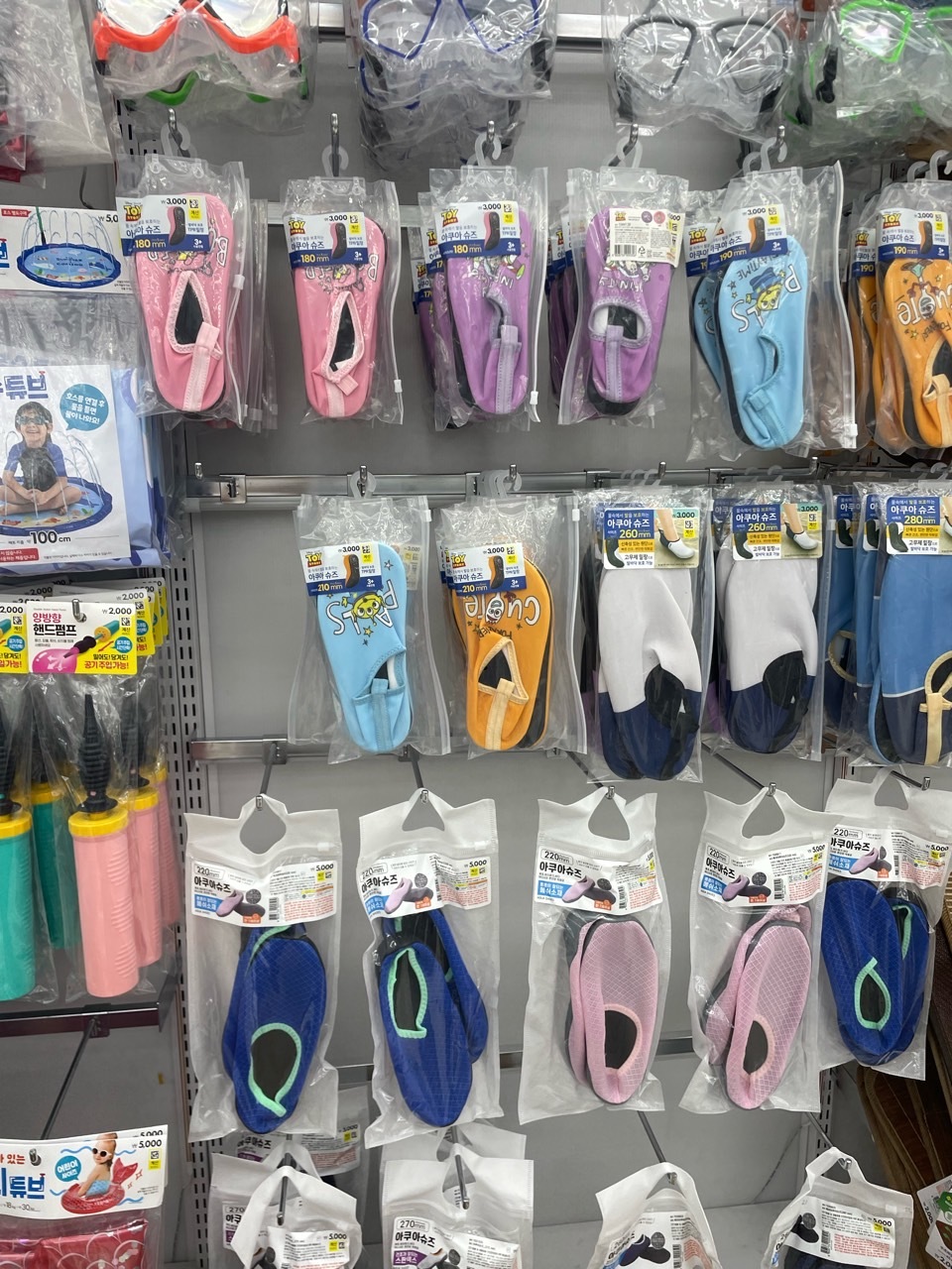 아쿠아슈즈가 종류별로 들어왔어요. 제일 작은 사이즈가 180부터 보이네요. 아쿠아슈즈는 좀 크게 신어도 되니 사이즈가 160인 유아들부터 쭉 신을 수 있겠어요. 가격도 아주 착하네요. 3000원입니다. 아동 180, 190,200,210 사이즈 있고 성인 사이즈도 있습니다. 일단 보이는 건 220, 260이 보이네요. 그런데 어른 건 별로 안 이쁘네요. 가격은 5000원으로 아주 착합니다. 아쿠아슈즈 같은 경우엔 딱 여름 한철만 신으니 길면 2년, 짧으면 한 해만 신기고 작아지는 경우가 대부분이죠. 다이소에서 딱 맞게 가볍게 신기는 것도 아주 좋은 것 같습니다.