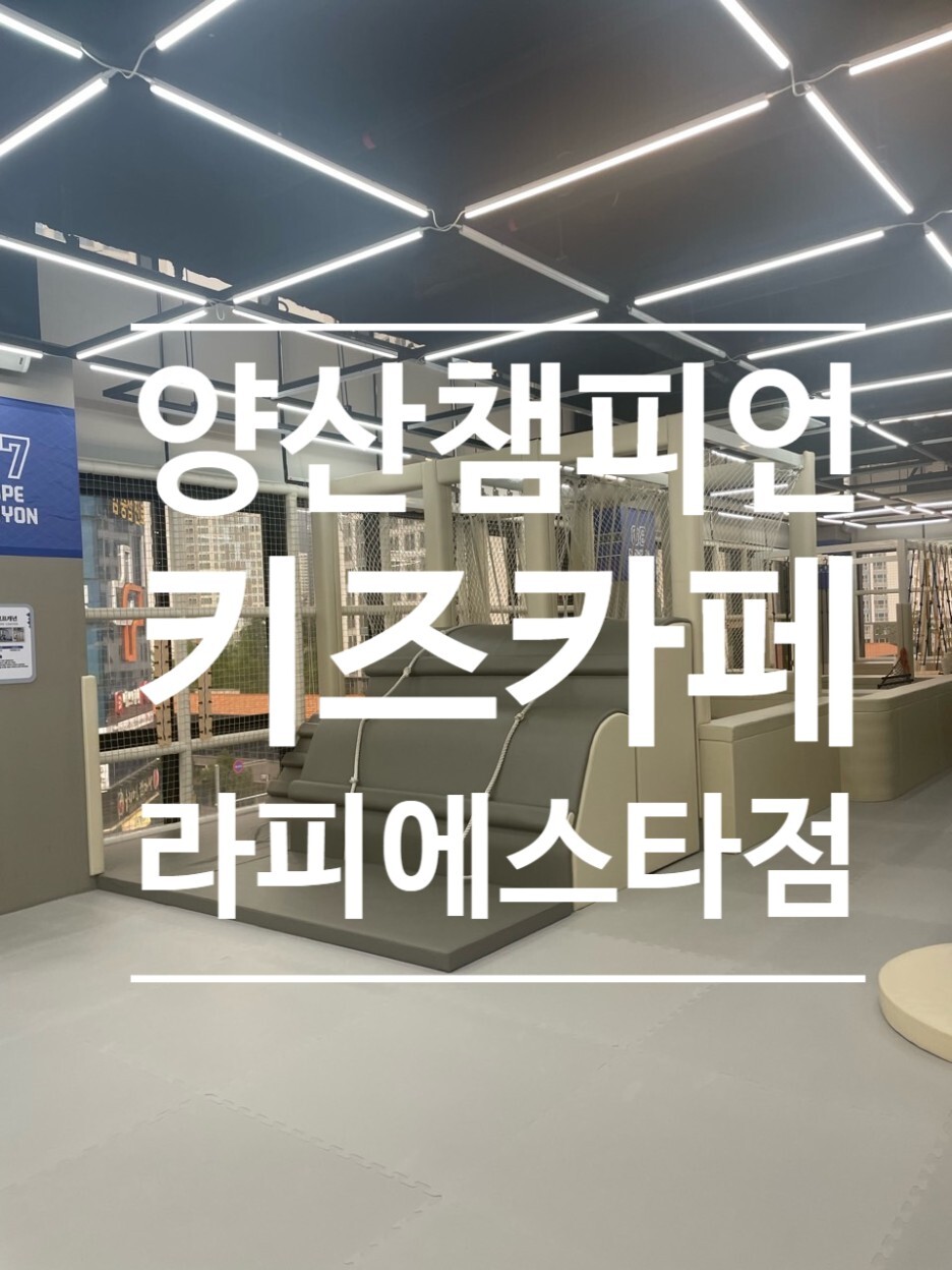 요즘 비가 많이 와서 아이들과 어딜 갈지 막막하시죠? 외출을 안 하기도 뭐하고. 좋은 추억 쌓아 줘야 하는 데 어디 갈 데는 없고. 그래서 저는 한 번씩 아이의 에너지를 소비하라고 키즈카페를 다녀와요. 이제 하율이가 좀 컸다 보니 아기 아기 한 키즈카페는 안 좋아합니다. 그렇다고 너무 액티비티 한 건 오빠들에게 치여 힘들어하더라고요. 그래서 전 챔피언 키즈카페를 종종 갔다 와요. 안에 아이들이 놀 수 있는 시설들이 잘돼있고 만들기 체험도 할 수 있죠. 챔피언 키즈카페는 이마트 트레이더스점 또는 양산의 라 피에스타점을 종종 가요. 이마트 트레이더스 안의 챔피언 키즈카페는 챔피언 블랙벨트라고 해서 좀 더 프리미엄으로 안의 기구가 좀 더 다양하고 액티비티 하답니다. 반면 라 피에스타점은 딱 정석의 챔피언 키즈카페지만 아이들이 많이 붐비지 않아 마음껏 뛰어다니며 놀 수 있어요. 그럼 양산점 한번 볼까요?